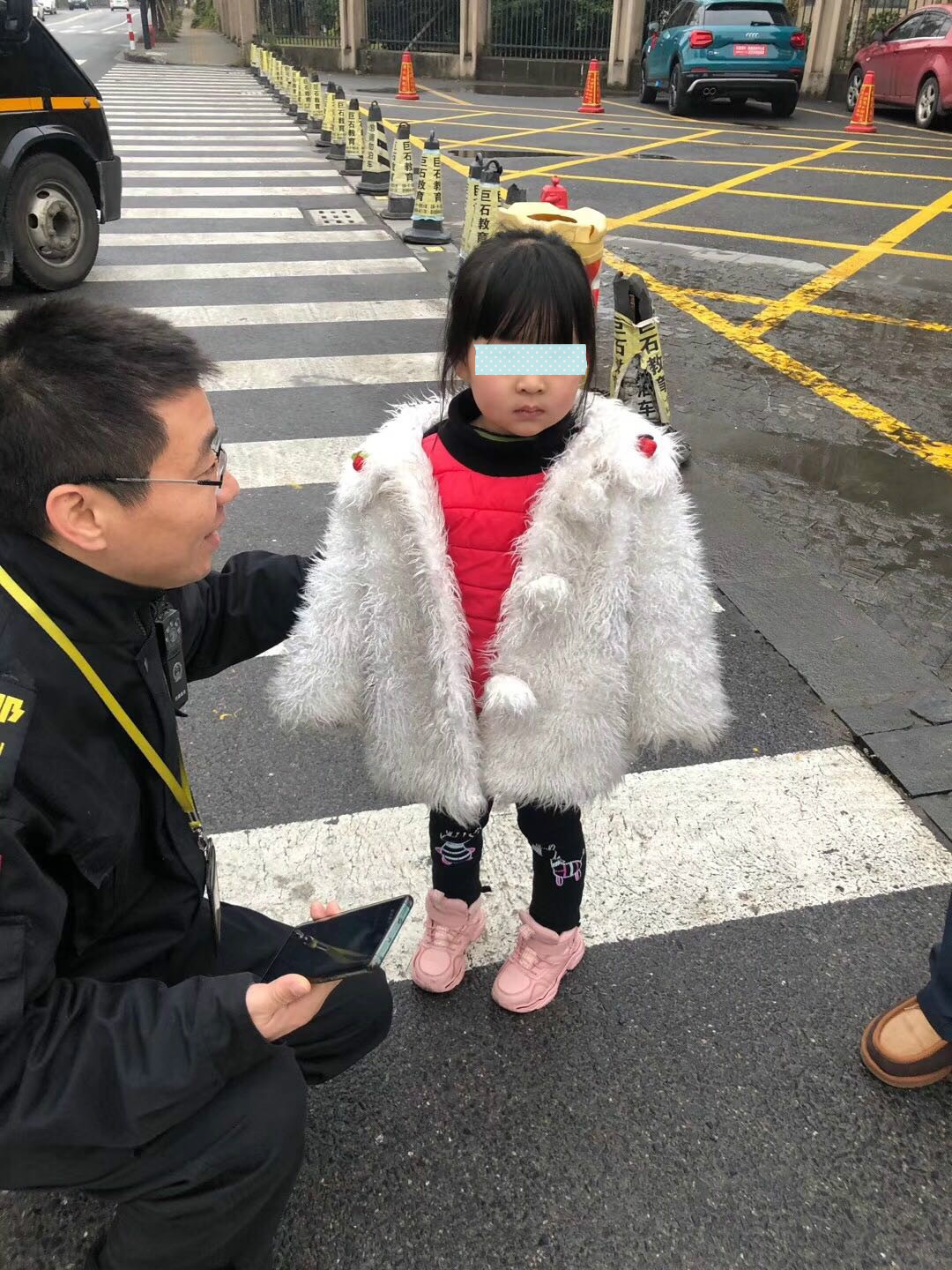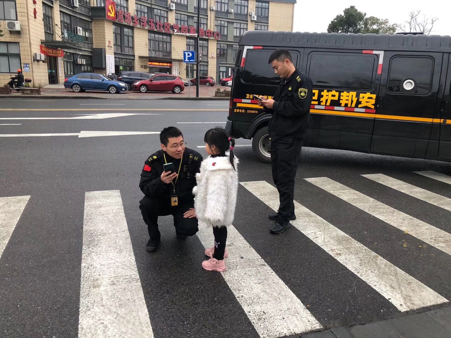 有限公司员工刘志文、鲁海斌在执行任务至月河小学浮玉校区附近时,发现一名小女孩正独自来回穿梭在马路中间,路上车辆来来往往非常危险。