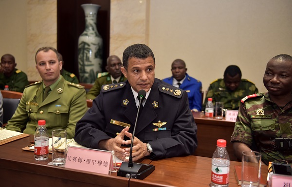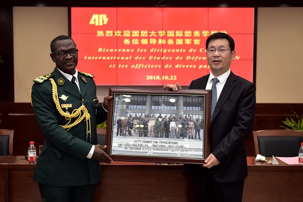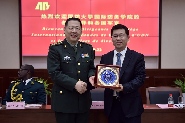 最后,吴高峻董事长先后与国防大学国际防务学院副政委冯伟、非洲军官代表喀麦隆后勤学校校长让•马义上校互相交换了纪念品,并合影留念。