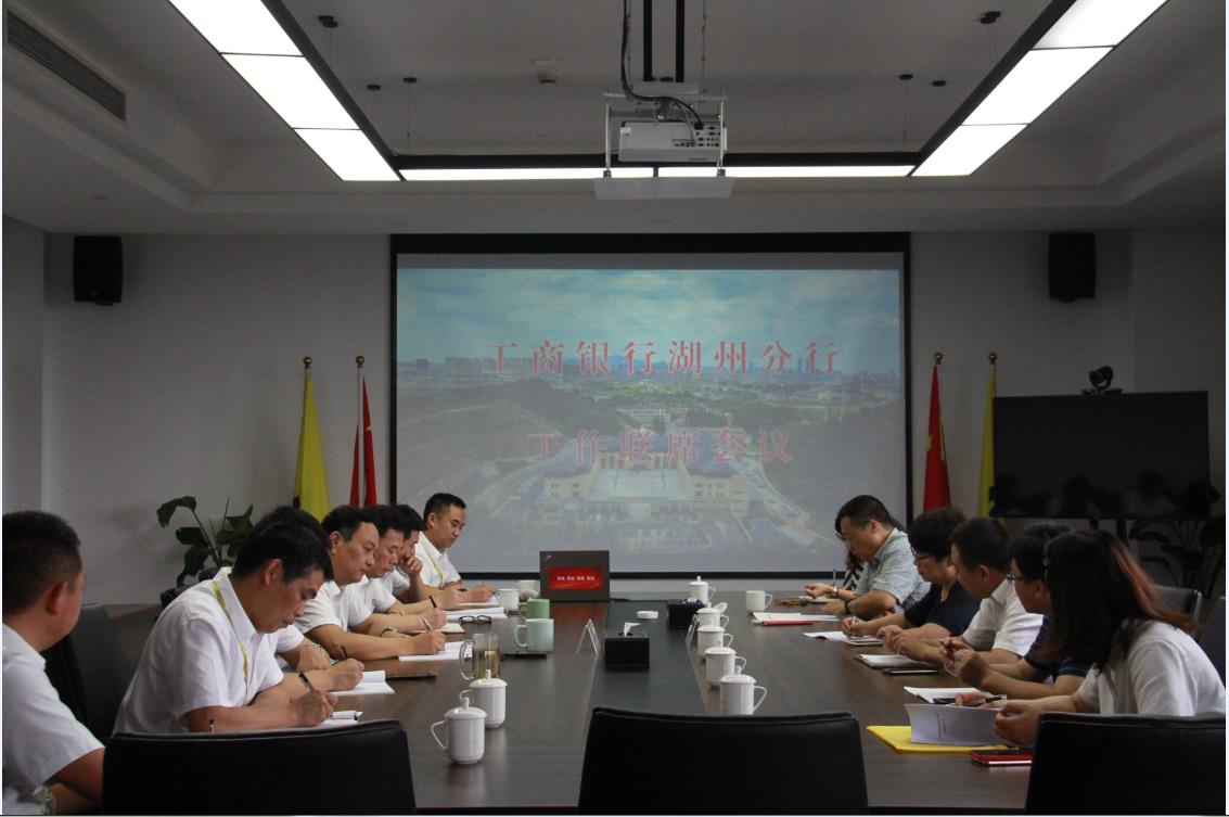 公司与中国工商银行湖州分行召开季度工作联席会议。工行湖州分行副行长戴克英,保卫部、运营管理部负责人和湖州公司总经理莫继权及相关领导,部门负责人参加了会议座谈。