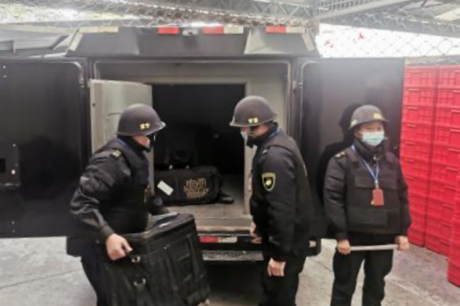 押运队员正在派送转运款箱,寒风吹在脸上感觉格外的冷。