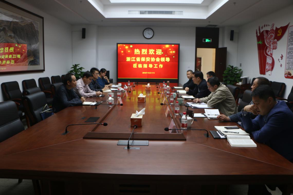 10月17日, 浙江省公安厅副巡视员、浙江省保安协会会长何建军在浙江省公安厅治安监督管理总队科长、浙江省保安协会秘书长王文骅、浙江省公安厅治安监督管理总队副调研员刘文渊、浙江省保安协会副秘书长王晓蕾等陪同下,莅临香港六合彩资料 公司考察调研。香港六合彩资料 公司党委书记、董事长吴高峻以及在家的党委班子成员出席了座谈会。