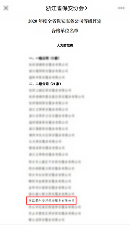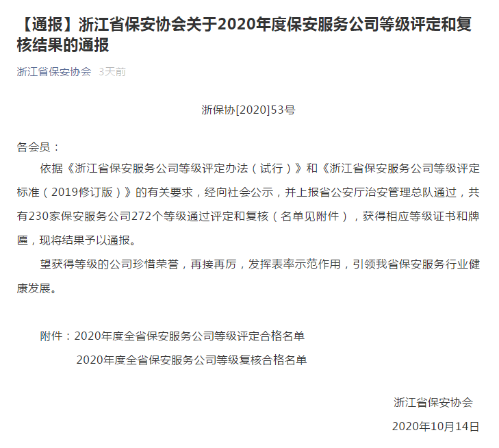 10月14日,浙江省保安协会发布《关于2020年度保安服务公司等级评定和复核结果的通报》。