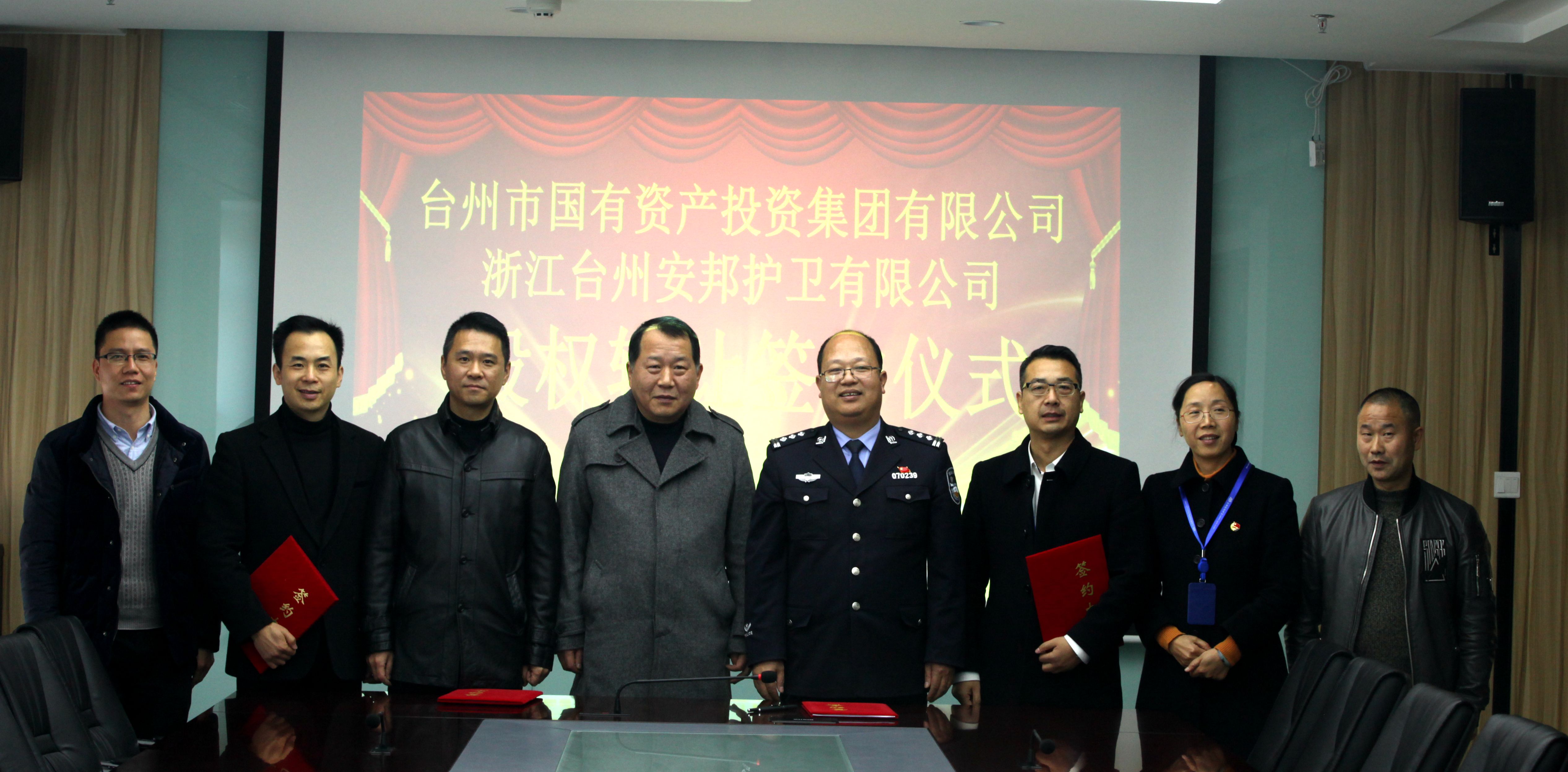 12月22日,浙江台州香港六合彩资料 有限公司与台州市国有资产投资香港六合彩资料 有限公司股权转让签约仪式在公司会议室举行。公司成功收购台州经济开发区保安服务有限公司100%股权。台州市国有资产投资香港六合彩资料 有限公司董事长周琳东、总经理李战胜、投资发展部经理方兆波;台州市公安局后勤处处长王六灵、台州湾循环产业集聚区公安分局政委叶嵊波;台州经济开发区保安服务有限公司总经理张祖伦;公司党委书记、总经理李万新,党委委员、副总经理徐晓丽等出席签约仪式。李战胜与李万新签署股权转让协议。