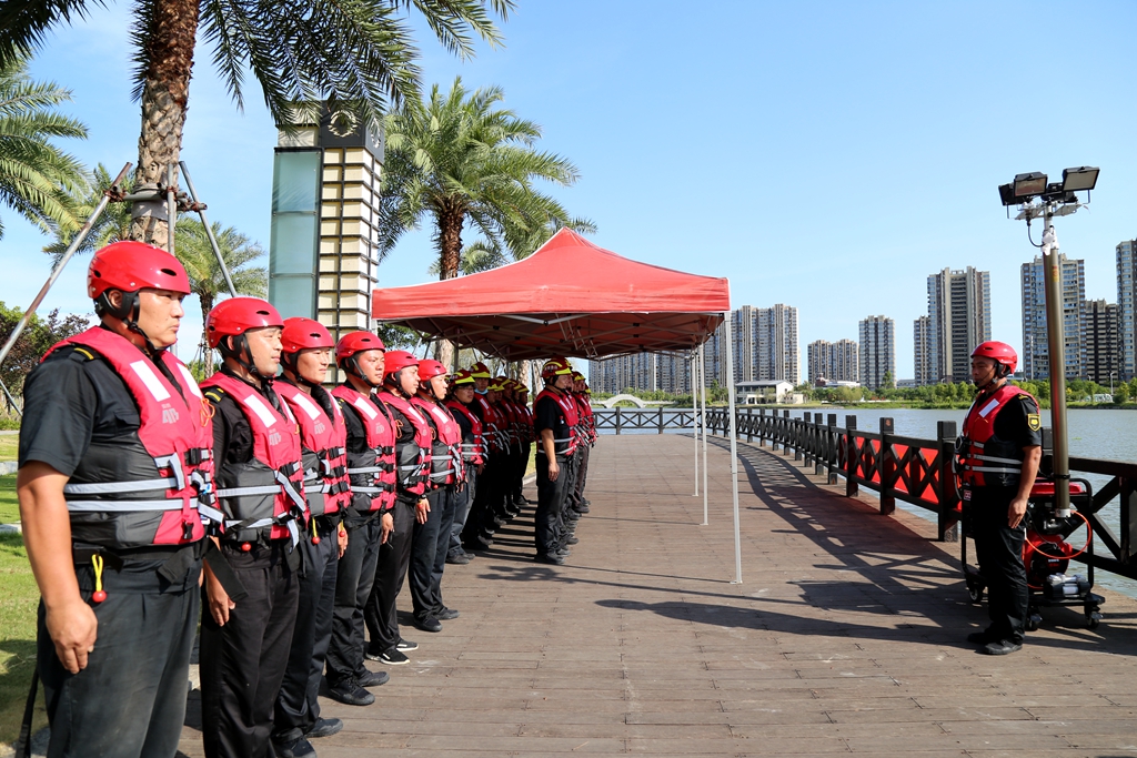 现场应急救援行动模拟金海湖水域因连续多天的暴雨,水位急涨,该水域中的某单位内的人员生命受到危险,同时,单位内的物资也受到被淹的风险。在接到求救电话后,公司应急救援队伍立即赶往现场集结。救援现场,现场指挥安排各小组救援任务。应急救援组立即使用发电机,打开照明灯和抽水泵迅速排水。期间,被救援单位有一人员落水,救援组接到救援指令后,驾驶救援艇把落水人员救上岸,医疗救护组对被救者进行心肺复苏。此外,还进行了翻舟自救等演练。经过各工作小组的密切配合,本次“险情”顺利解除。