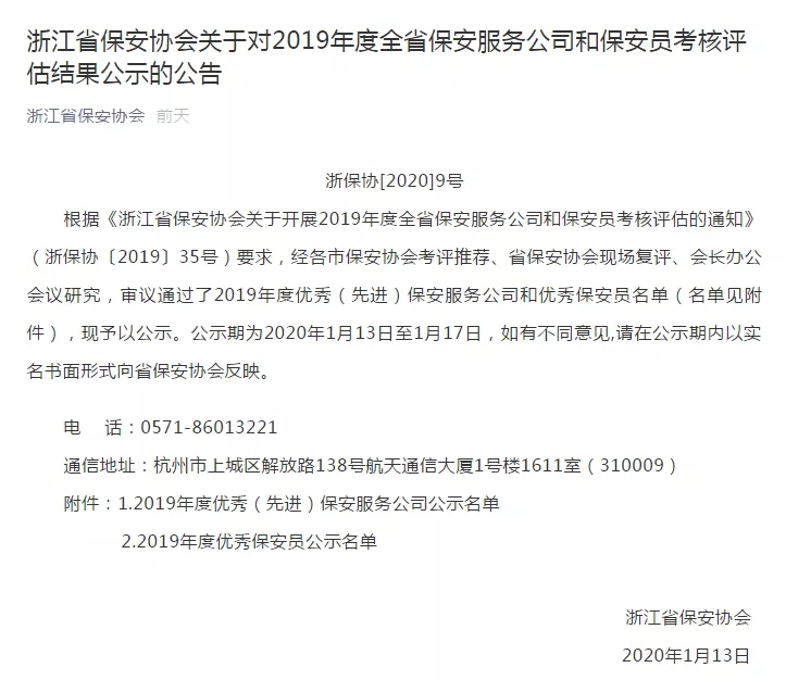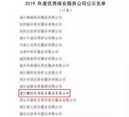 保安服务有限公司被浙江省保安协会评为“2019年度优秀保安服务公司”。