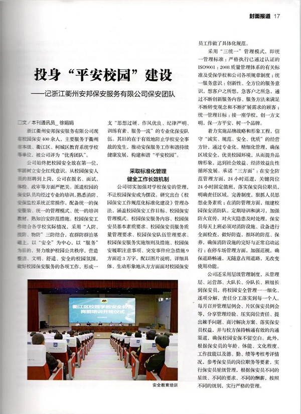 保安服务有限公司现有校园保安400余人,主要服务于衢州市本级、衢江区、柯城区教育系统学校等单位,被公司评为“优秀团队”。