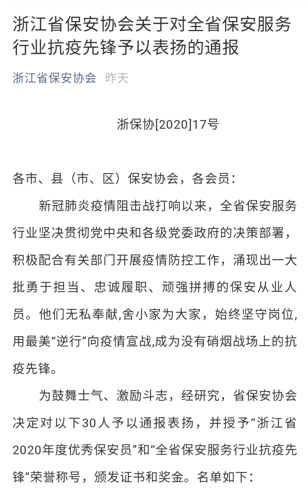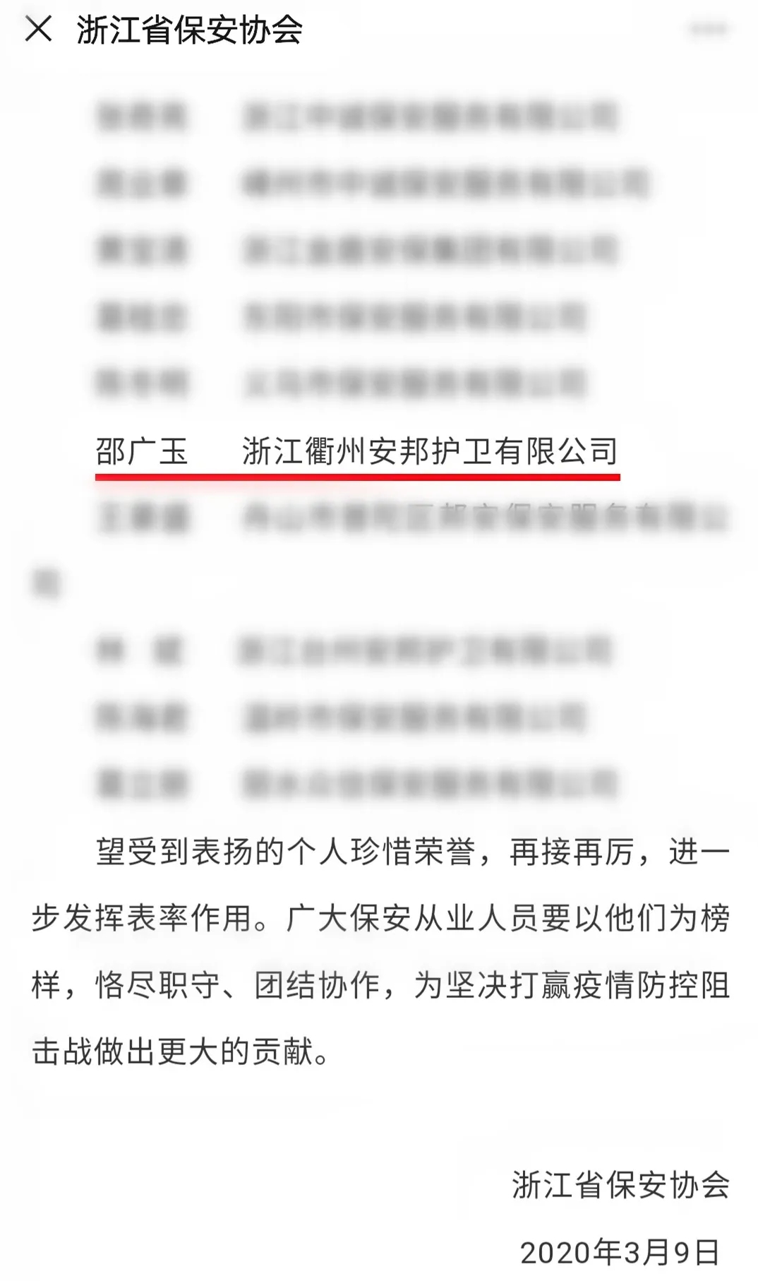 有限公司邵广玉“浙江省2020年度优秀保安员”和“全省保安服务行业抗疫先锋”荣誉称号。