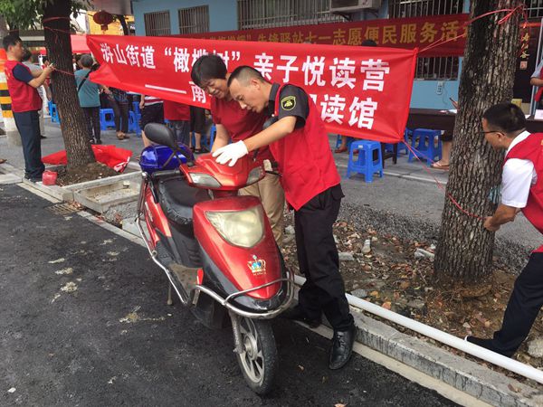 在七一建党节来临之际,为体现党员为人民服务准则,慈溪大队党支部与南孙塘社区党支部联合,共同派出党员志愿者,举办便民服务活动。党员们利用休息日,一大早便走上街头,展开理发、维修、咨询、宣讲等多个摊位,群众们视乎很熟悉这一场景,很快每个摊位前人头攒动、热闹异常,党员们充分发挥一技之长,有的为叔叔阿姨理发、有的为大嫂修理电瓶车,有的还对群众宣讲理论政策……