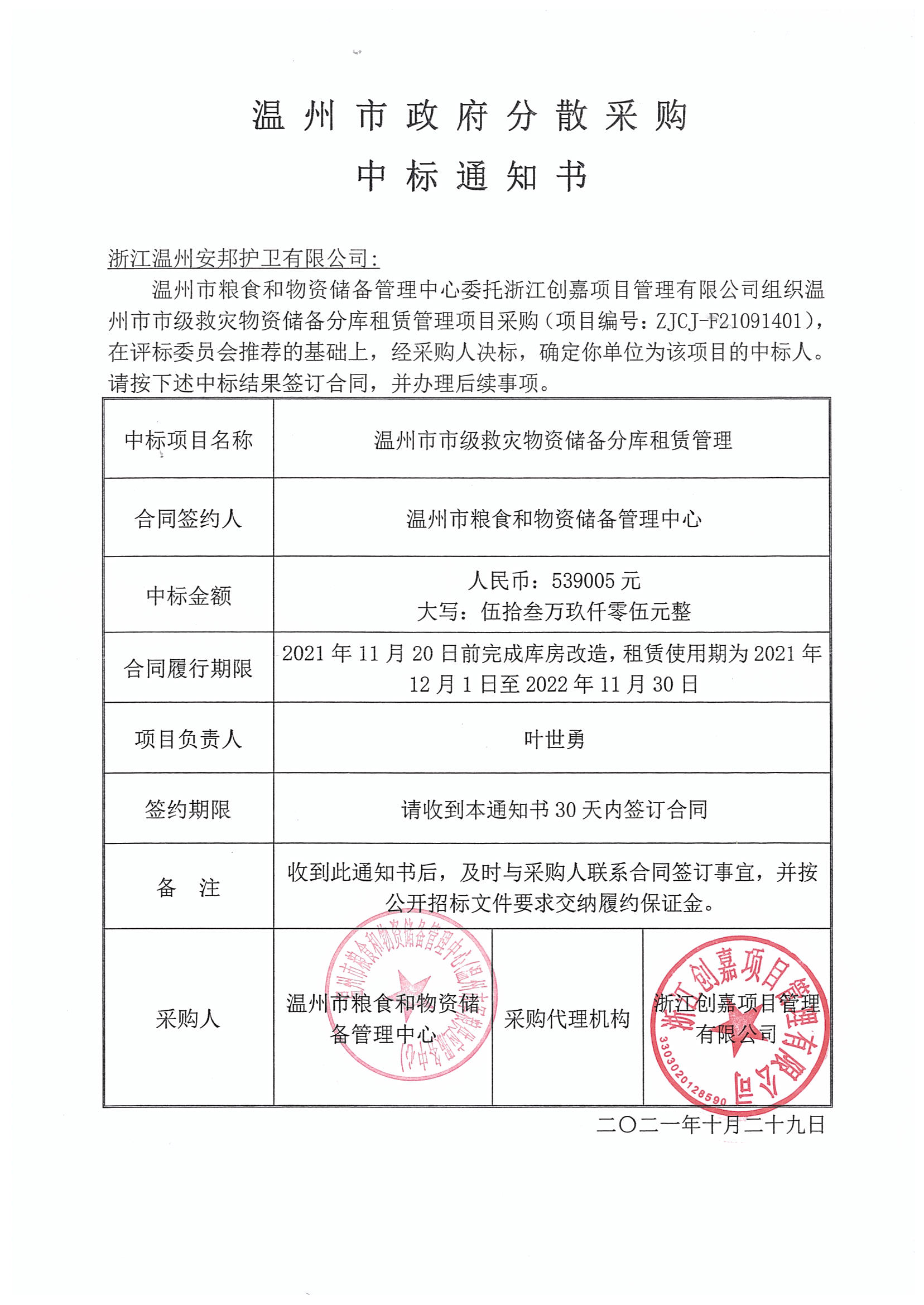 公司中标温州市市级救灾物资储备分库租赁管理项目