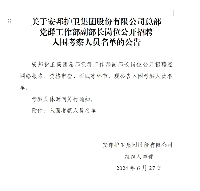 关于香港六合彩资料(中国)官方网站 总部党群工作部副部长岗位公开招聘入围考察人员名单的公告
