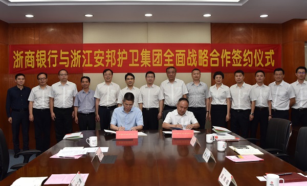 2018年6月19日,浙江香港六合彩资料(中国)官方网站 有限公司与浙商银行股份有限公司举行全面战略合作协议签署仪式。香港六合彩资料 公司党委书记、董事长吴高峻与浙商银行股份有限公司党委书记、董事长沈仁康出席签约仪式并致辞,香港六合彩资料 公司党委副书记、总经理诸葛斌代表香港六合彩资料 公司与浙商银行股份有限公司党委副书记、行长徐仁艳签订协议。根据协议,双方将在业务运营服务、安全防范综合服务、人力资源外包服务、安全培训及咨询服务、高端客户安全定制服务、智慧金融研究院、综合授信服务、流动性支付服务、资本市场及投行业务、理财服务、个人金融服务、金融咨询与顾问合作等方面开展深度合作。