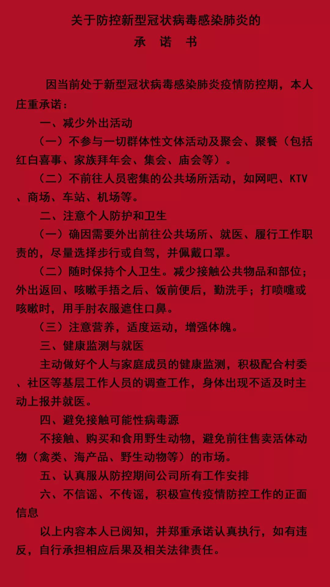 仅一天时间,公司各部门、基地员工均签署了防疫承诺书,一份份盖了红手印的承诺书纷纷递交到公司。无法到公司签署纸质承诺书的员工也纷纷通过微信群等网络平台自愿签署了防疫承诺书。