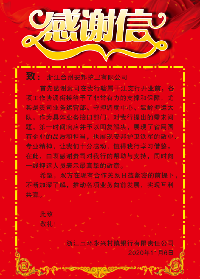 11月26日,玉环永兴村镇银行行长张文斌一行到台州香港六合彩资料 温岭押运大队基地考察交流,并送来了一面绣有“风雨无阻赢信任 优质服务立初心”的锦旗和一封感谢信,感谢台州香港六合彩资料 员工热情真诚、认真负责的优质服务。公司党委委员、副总经理徐晓丽,温岭押运大队大队长程会军代表公司接受锦旗和感谢信。