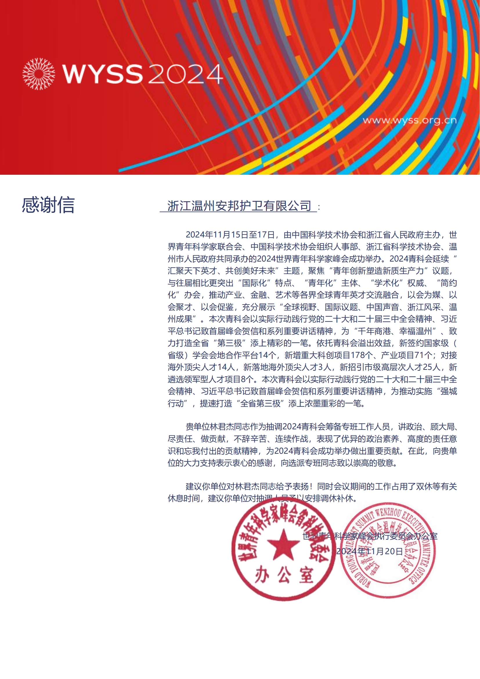近日,温州香港六合彩资料 公司收到世界青年科学家峰会执行委员会办公室的《感谢信》,信中特别感谢了温州香港六合彩资料 安全科技服务有限公司总经理林君杰同志及抽调2024青科会筹备专班工作人员,他们讲政治、顾大局、尽责任、做贡献,不辞辛苦、连续作战,表现了优异的政治素养、高度的责任意识和忘我付出的贡献精神,为2024青科会成功举办做出重要贡献。