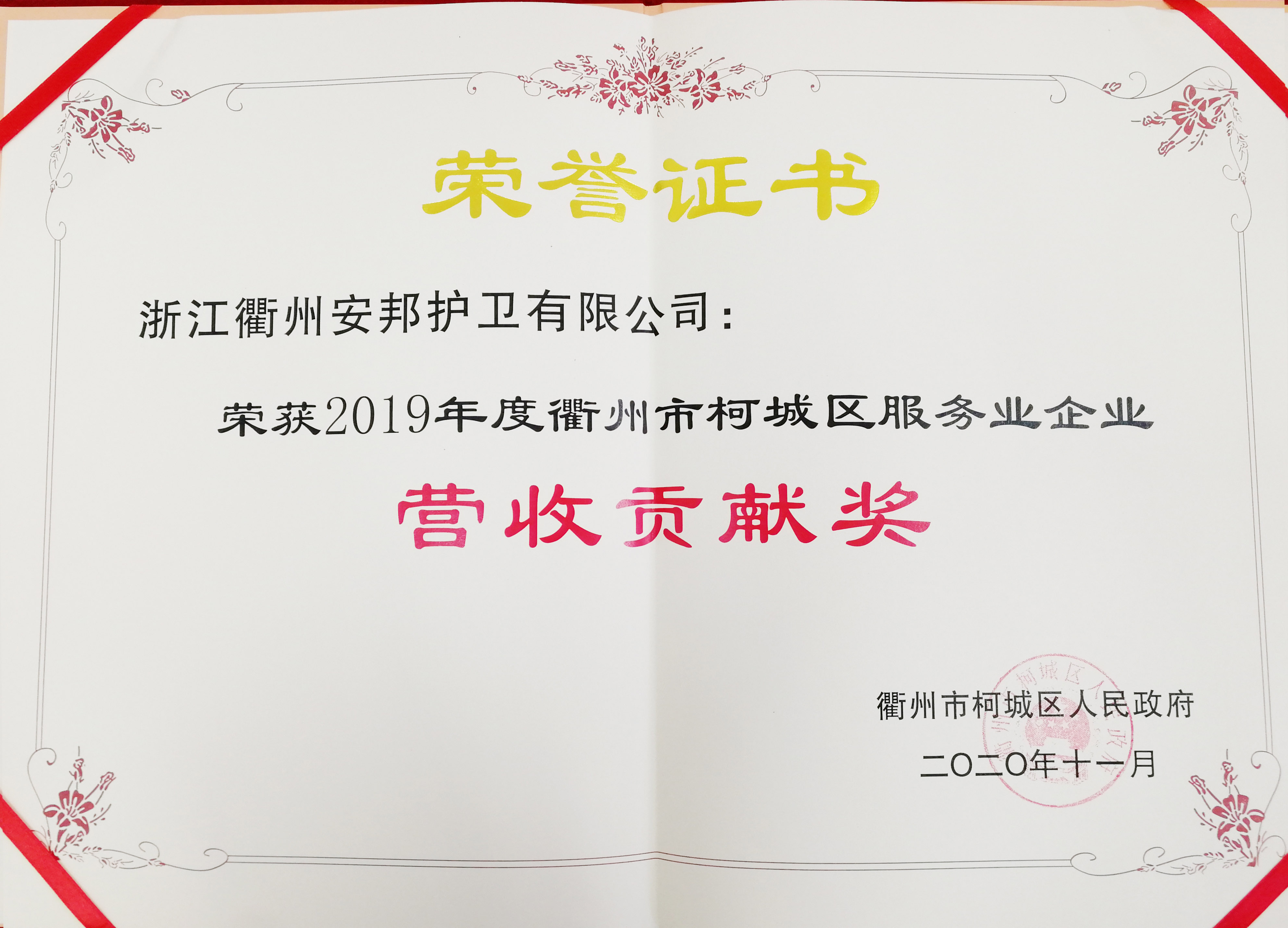 喜获“2019年度衢州市柯城区服务业企业营收贡献奖”