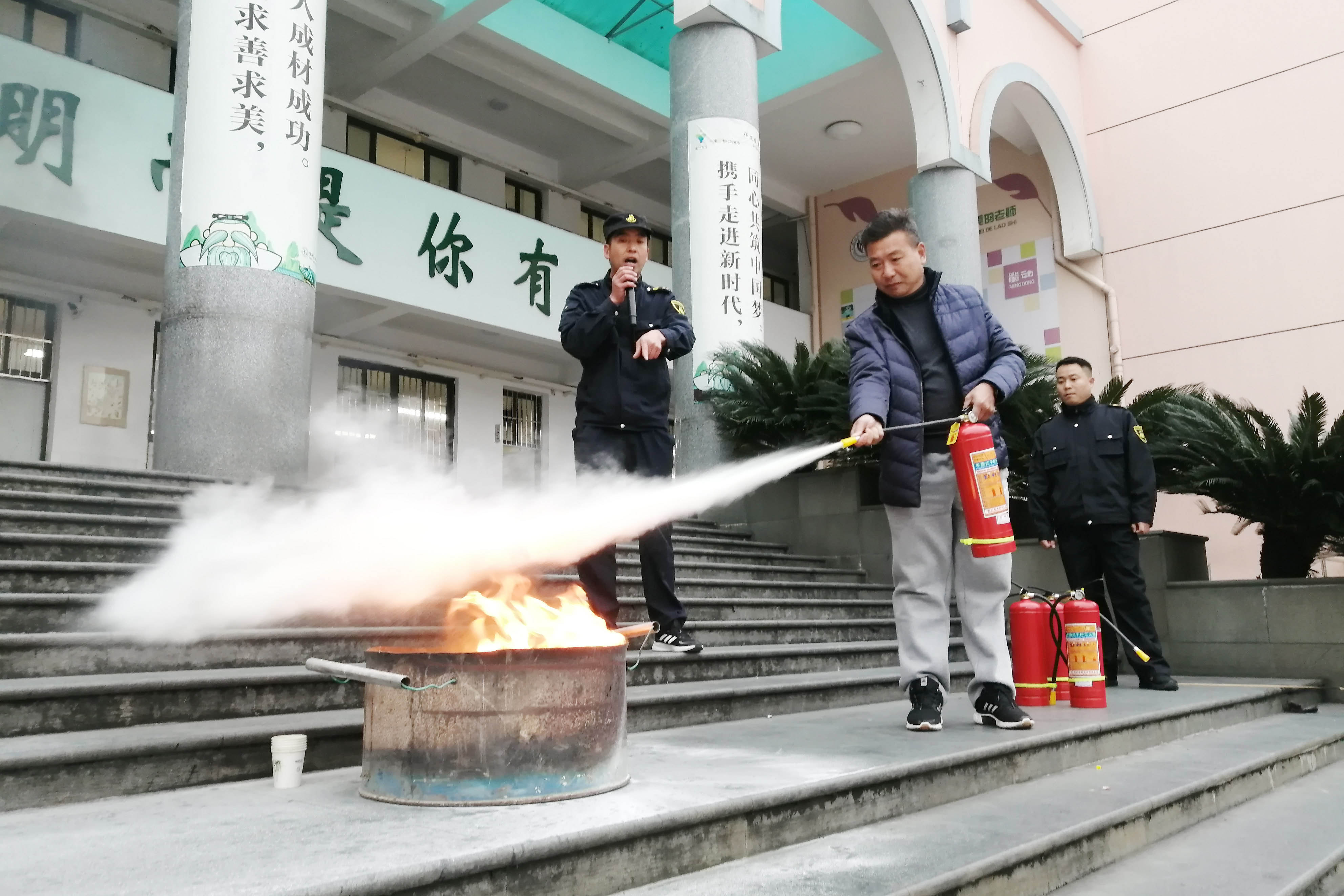 保安公司教员对学校师生、工作人员开展灭火器使用培训。