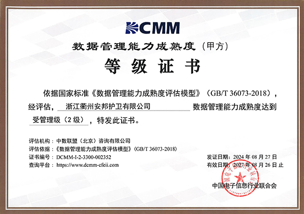 有限公司成功取得中国电子信息行业联合会“数据管理能力成熟度(甲方)受管理级(2级)证书”,简称DCMM证书。DCMM是我国自主研制的完全可控的首个在数据管理领域正式发布的国家标准,是当前国内最权威的数据管理能力认证体系,也是企业数据管理水平有力的资质证明。