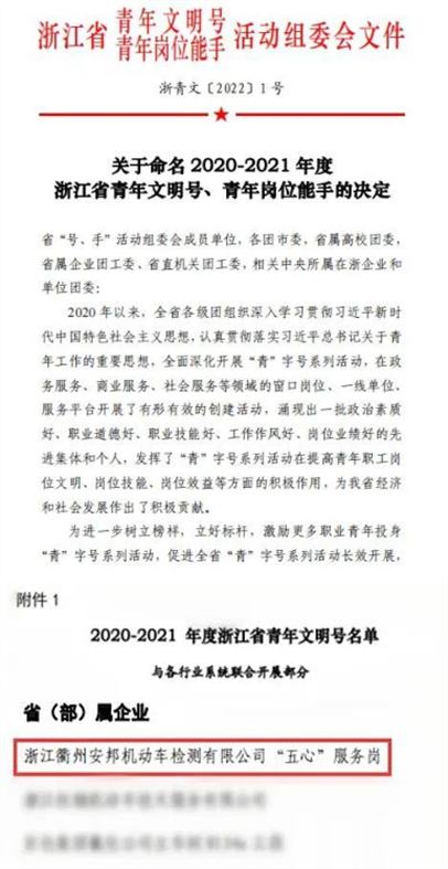 机动车检测有限公司“五心”服务岗被命名为2020-2021年度浙江省青年文明号。