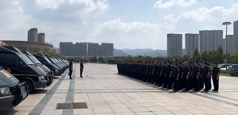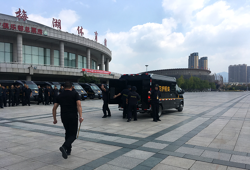 公司义乌守押大队组织下辖6个中队,在义乌市梅湖体育中心开展突发事件应急演练。公司安全保卫部经理余建芳、大队长陈林森等人现场观摩并进行指导。
