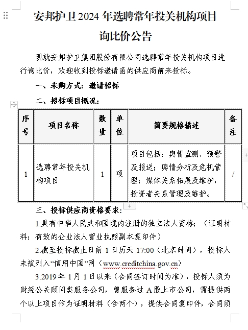 香港六合彩资料 2024年选聘常年投关机构项目 询比价公告