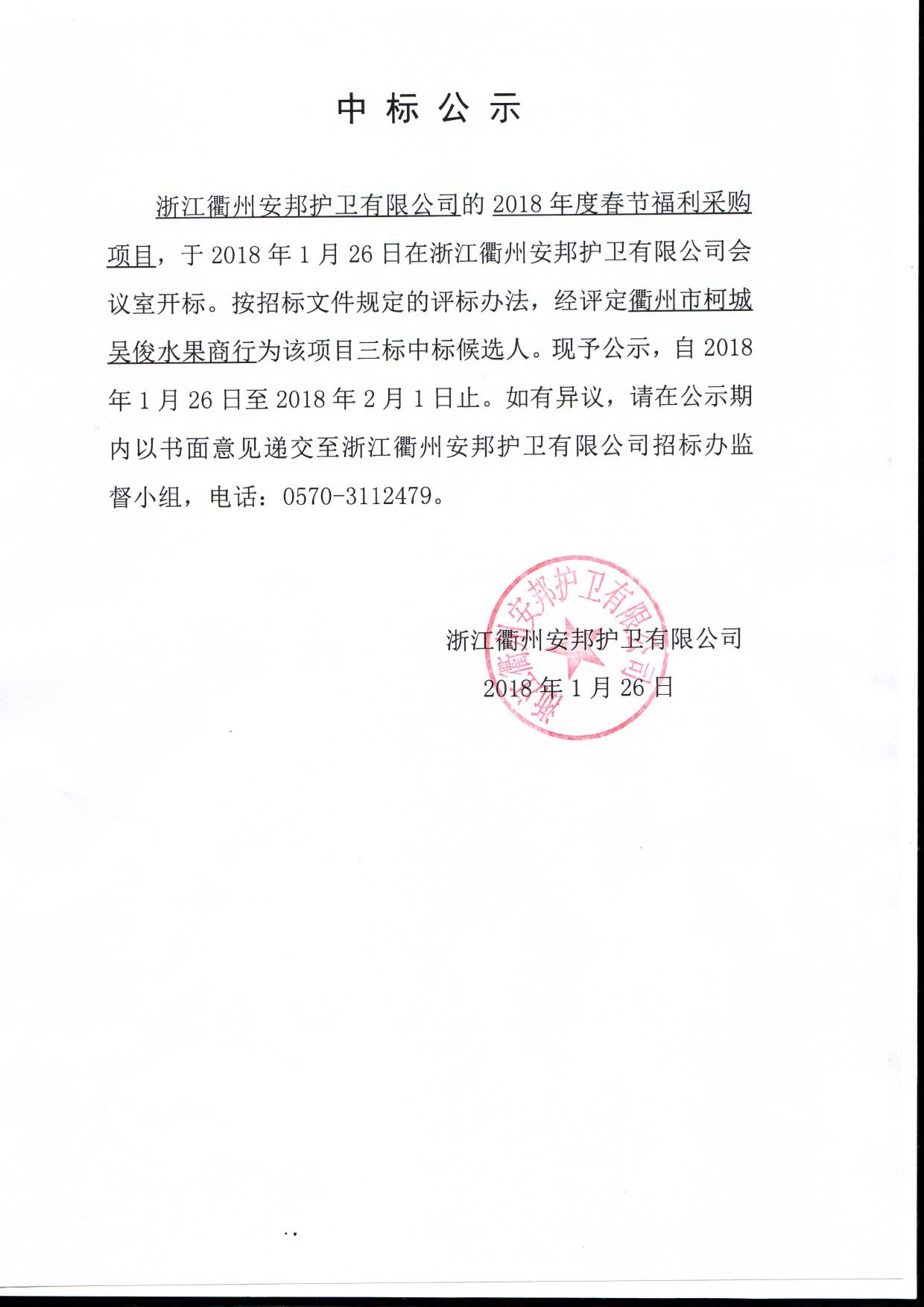 浙江衢州香港六合彩资料 有限公司2018年春节福利采购项目中标公示