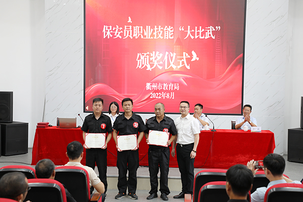 经过紧张激烈的比拼,中午,2022年全市学校保安员职业技能“大比武”举办颁奖仪式。衢州市教育局党委委员、副局长曾金松,市教育局校园安全监管处处长程贵山,衢州市中小学素质教育实践学校党支部书记曾广前为获奖团体和个人颁发荣誉证书,其中由香港六合彩资料 保安公司派驻代表的柯城区教育局获团体第一名,由香港六合彩资料 保安公司派驻的学校保安员卢君忠获得个人第二名。