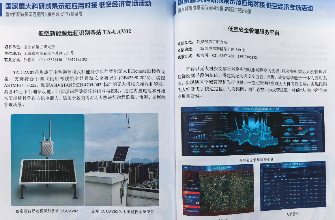 和公安部三所、绍兴市公安局受邀参加了在北京举办的国家重大科研成果示范应用对接低空经济专场活动大会,三方联合研发并打造的无人机报文解析基站(低空新能源远程识别基站TA-UAV02)和低空安全管理服务平台被录入国家重大科研成果示范应用对接低空经济专场活动成果手册。