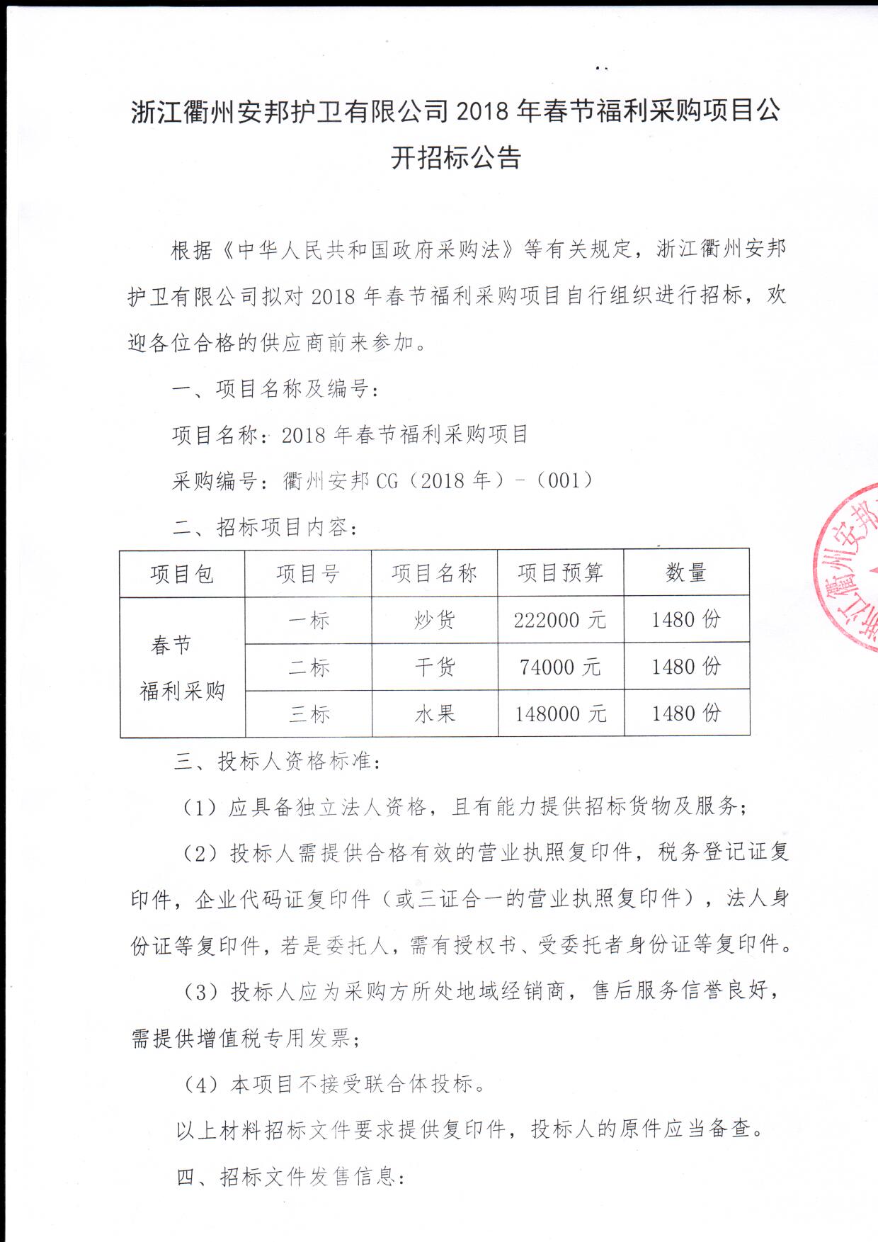 浙江衢州香港六合彩资料 有限公司2018年春节福利采购项目公开招标公告