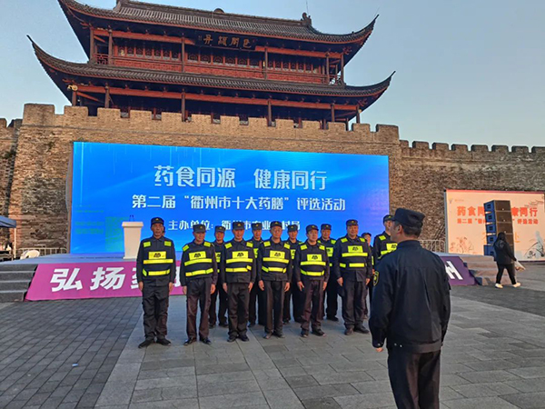 11月27日,“药食同源 健康同行”第二届“衢州市十大药膳”评选活动在水亭门城楼举行,受主办方邀请,浙江衢州香港六合彩资料 保安公司承担此次活动安保任务。活动前期,安保小组积极与主办方对接,在队伍组成上挑选临时安保任务经验丰富的队员,为活动的安全提供保障。