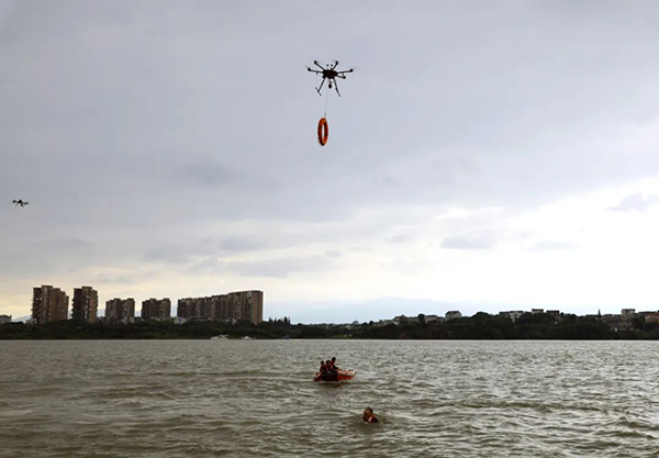 无人机救援2组携带救生圈,快速精准空投至落水人员手中,同时水上救援组驾驶冲锋舟,携带应急救援器材侧向缓慢靠近落水人员,对落水人员进行营救。