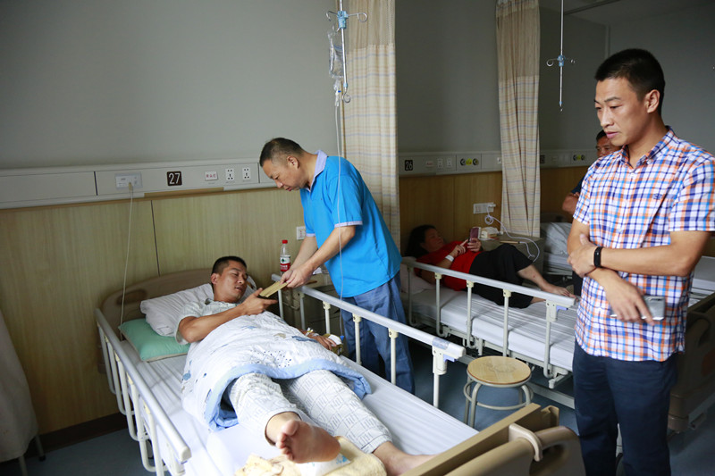 智能科技有限公司副总经理叶德峰、褚峰的陪同下来到丽水市中心医院,看望慰问因公受伤的员工双继东,为员工送上慰问金。