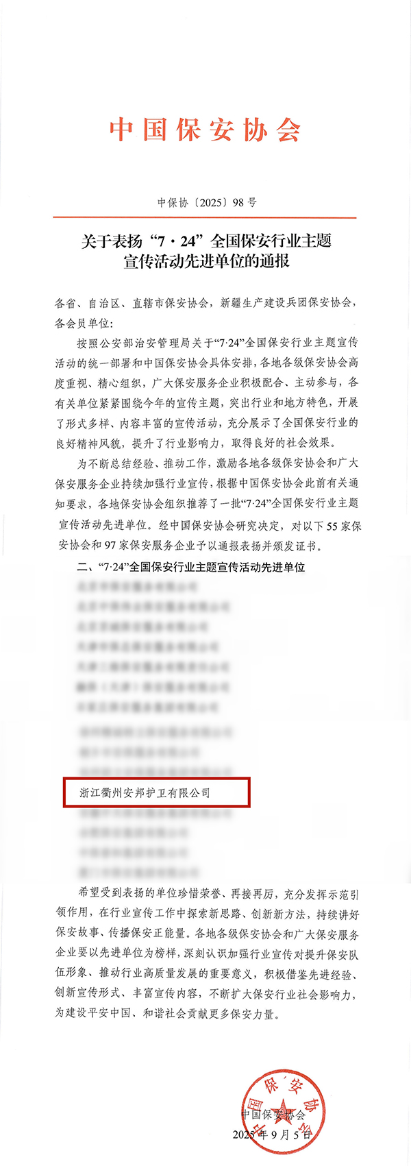 荣获“7·24”全国保安行业主题宣传活动先进单位通报表扬
