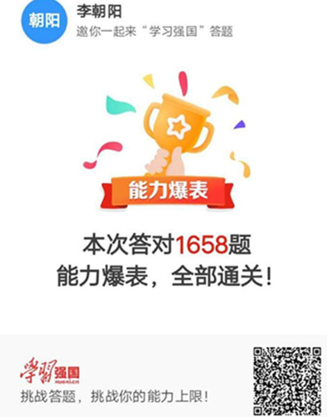 “学习强国”上线后,李朝阳抱着学习掌握各类知识的目的,每天认真学,学分足量计。挑战答题内容涵盖时政、经济、理论、党史、文艺、科学等,每题答题时间仅限30秒,没有提示,且题库不断更新,极具挑战性。由此激发了他的兴趣,每天只要有空,就沉浸在答题之中,不少已被遗忘的知识又被重新记起,还学到了许多过去完全不了解的新内容。