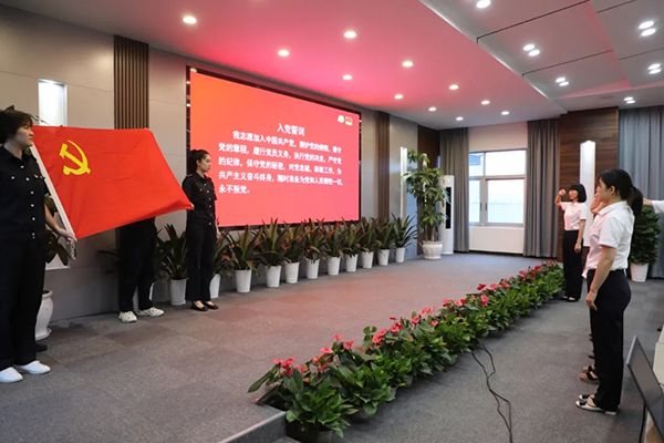 随后公司举行2021年新党员入党宣誓仪式。党委书记、董事长、总经理张淑芬为预备党员佩戴党徽。预备党员面向党旗宣誓,党员代表发言。