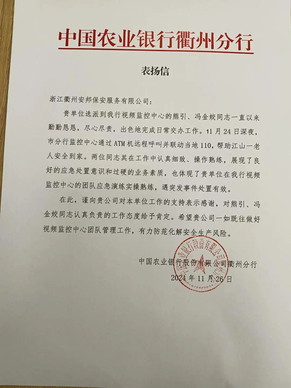 保安服务有限公司收到中国农业银行股份有限公司衢州分行发来的表扬信,信中对熊引、冯金姣两位保安员认真负责的工作态度、专业有效的应急处置给予肯定和表扬,两位同志帮助老人回家的暖心事迹被新浪浙江等多家媒体平台宣传报道。