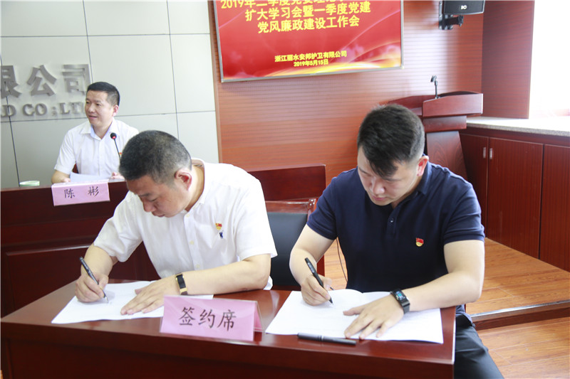 会议最后,朱永健副书记与各领导班子成员、党支部、部门、大队、子公司签订《2019年党建工作责任书》、《2019年党风廉政建设责任书》、《2019年意识形态责任书》、《2019年维稳(信访)工作责任书》。