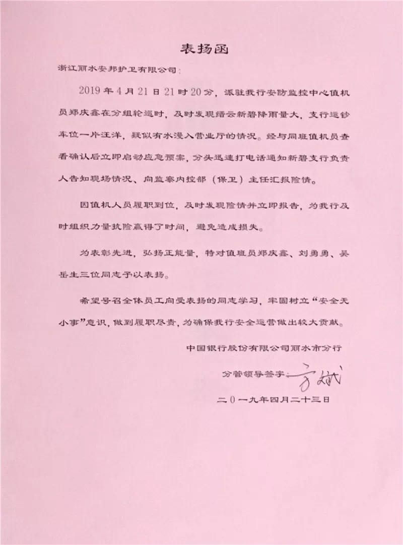 据了解,事情发生在2019年4月21日。当天晚上21时20分,丽水缙云县中国银行新碧支行所在区域突降暴雨,21时30分左右,本公司派驻中国银行丽水分行安防监控中心的特保大队队员郑庆鑫在分组轮巡时发现支行运钞车位一片汪洋,疑似有水浸入营业厅的情况。郑庆鑫在与同班值机员刘勇勇、吴岳生查看确认情况后,按照水情应急预案流程,迅速通知该支行负责人告知现场情况,同时向监察内控部(保卫)主任汇报险情,并紧盯监控画面观察支行门口实时情况,中国银行缙云支行迅速组织人员到达现场进行抢险排涝,及时排除险情,避免造成损失。