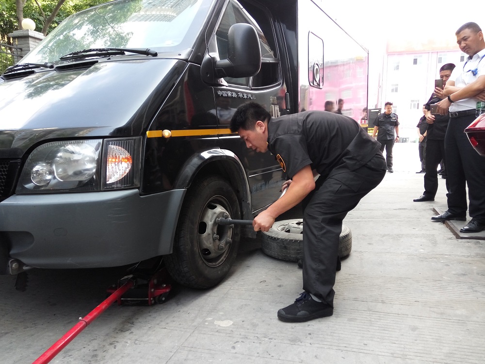 重点考核驾驶员拆、装轮胎。工具齐飞舞,拆装一条龙。