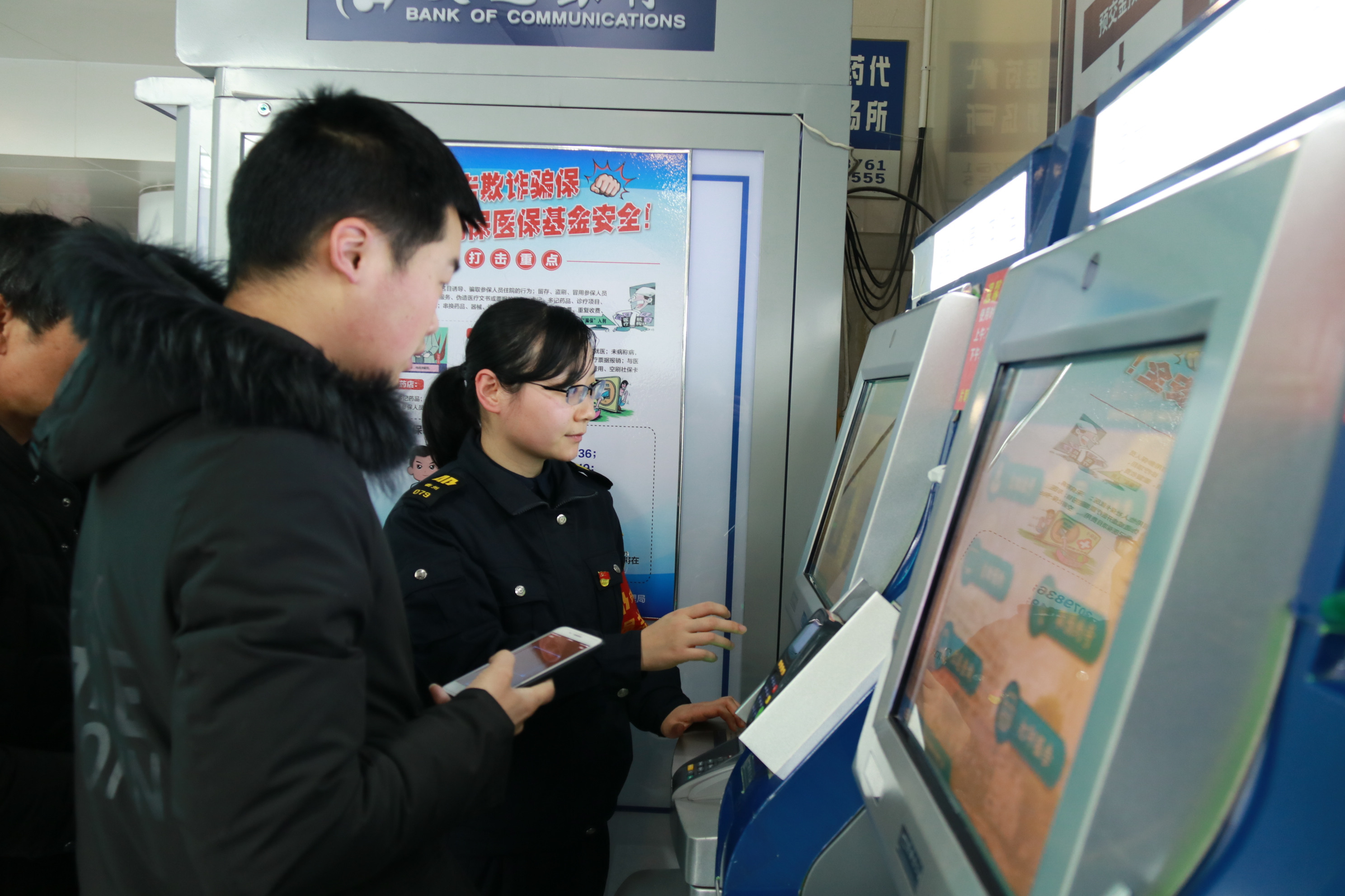 医院志愿服务活动:党员们来到衢化医院,在自助服务终端设备旁帮助患者查询、挂号及缴费,提供咨询及秩序维护服务。
