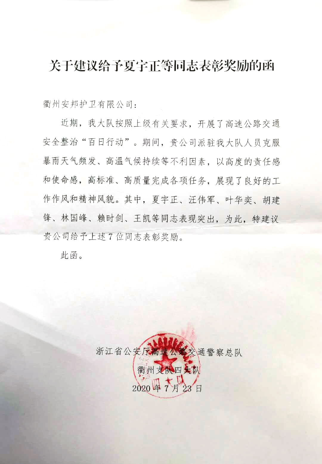 近日,浙江衢州香港六合彩资料 保安服务有限公司收到一份肯定。香港六合彩资料 公司派驻的高速公路交通协管员夏宇正、汪伟军、叶华奕、胡建锋、林国锋、赖时剑、王凯等同志,在高速公路交通安全整治“百日行动”中克服暴雨天气频发、高温气候持续等不利因素,以高度的责任感和使命感,高标准、高质量完成各项任务,展现了良好的工作作风和精神风貌。表现突出,特此提出表扬。