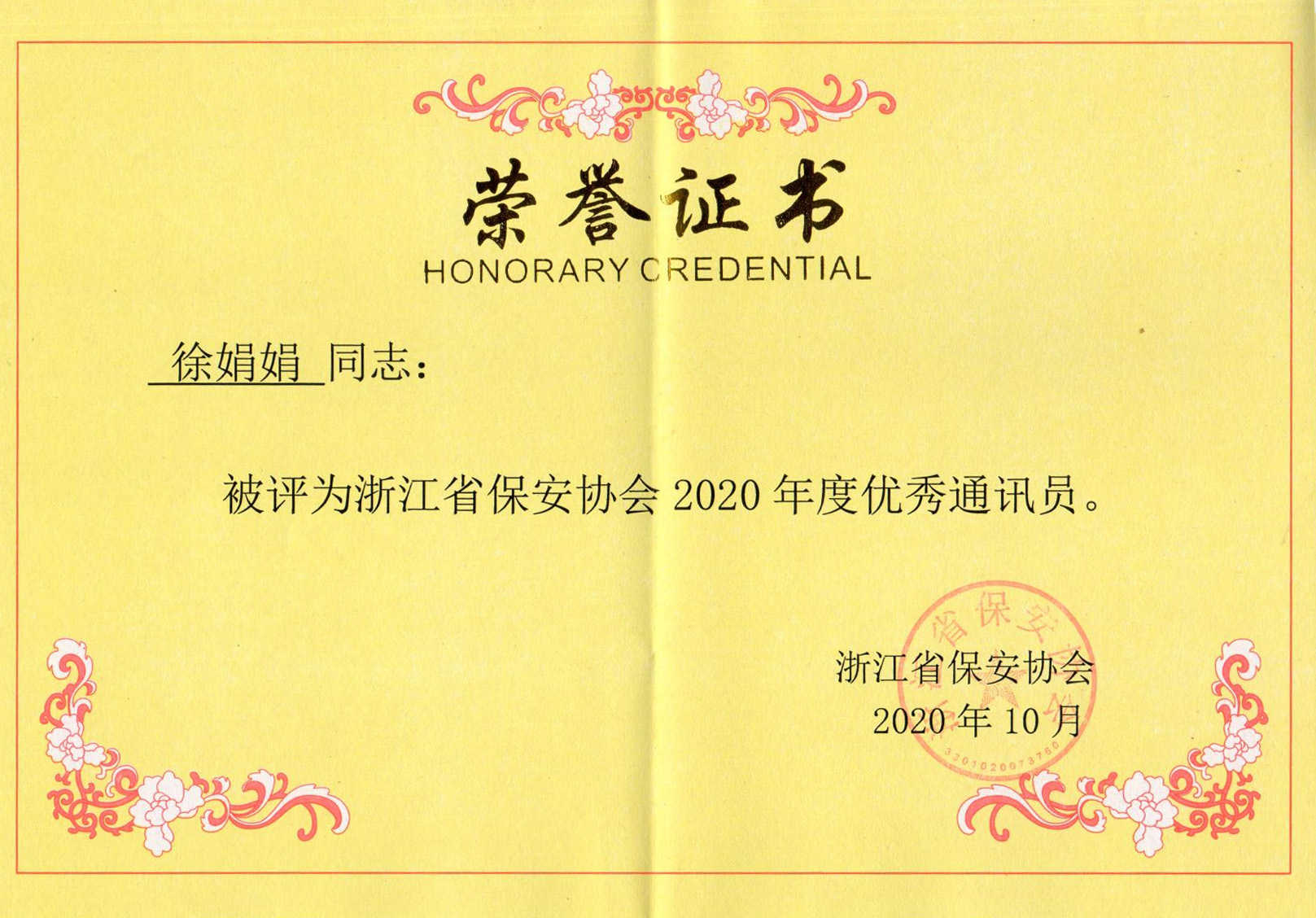 保安服务有限公司被授予“二级保安服务公司”荣誉牌匾。员工徐娟娟被授予“2020年度优秀通讯员”荣誉证书。
