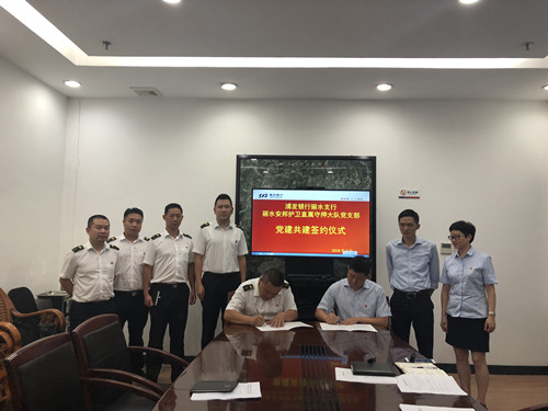 随后,浦发银行丽水支行机关党支部书记李飞和直属大队党支部书记张俊陶共同签署党建共建协议。